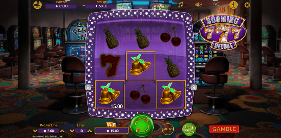 - Play Mode – Booming Seven Deluxe is a 3x3 reel video slot game with 10 paylines with Coin and 7s Symbols, X7 Multipliers, a Gamble Round, Bonus Spins, Two-Way Pay and Jackpot features.