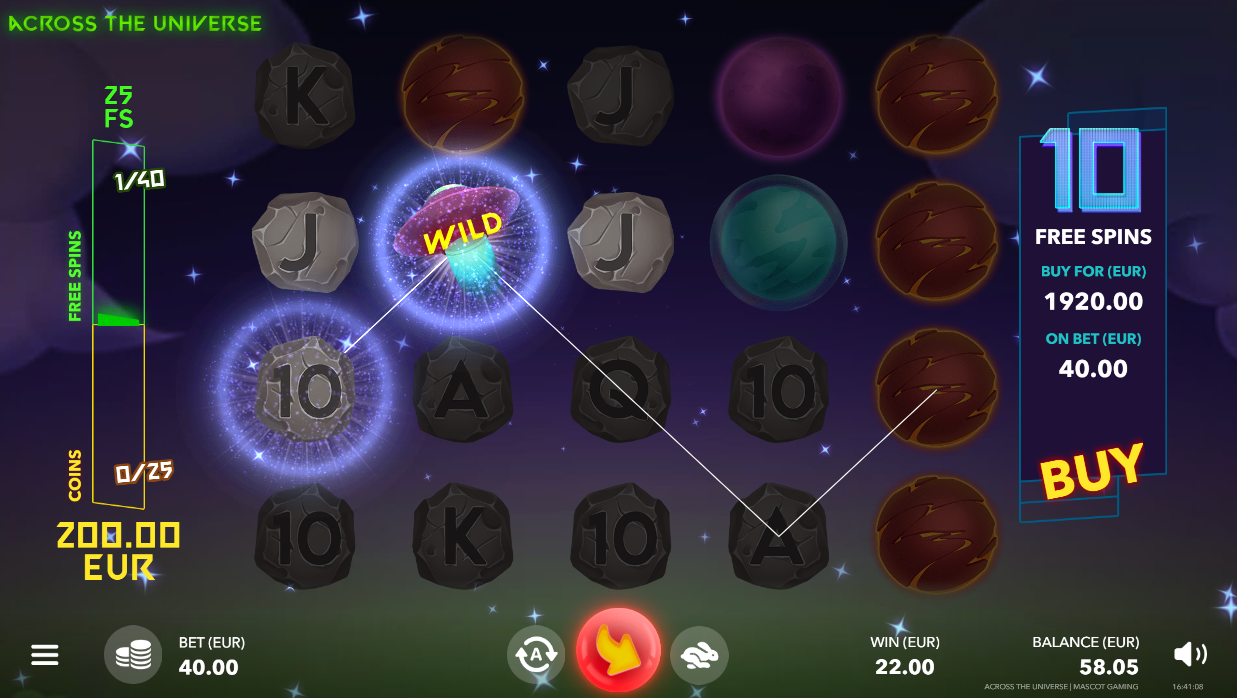 - Play Mode – Across the Universe is a 5x4 reel video slot game with 20 paylines, Wild Spaceship, Rocket Scatter, and Bonus symbols, Guaranteed Free Spins, Guaranteed Bonus, and Risk & Buy features.