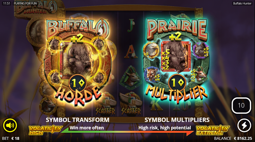 • Play Mode – Buffalo Hunter is a 5x4 reel video slot game with Wild Dreamcatcher, Totem Scatter, and Mystery Symbols, Buffalo Horde and Prairie Multiplier Free Spins, Stampede Super Bonus, and NoLimit Bonus Buy features.