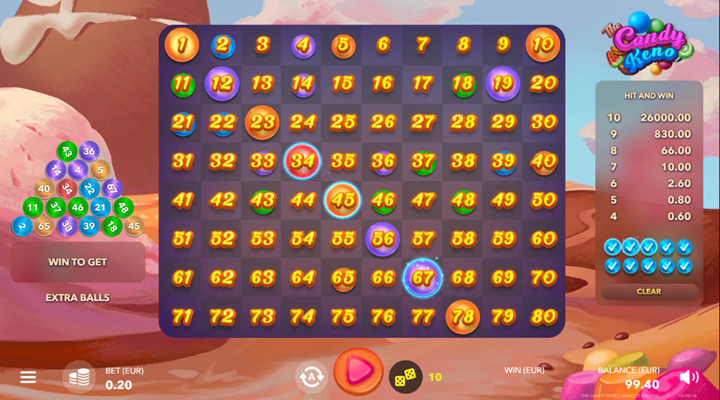 - 95.15% RTP (Return to Player) - The Candy Keno has an RTP of 95.15%.