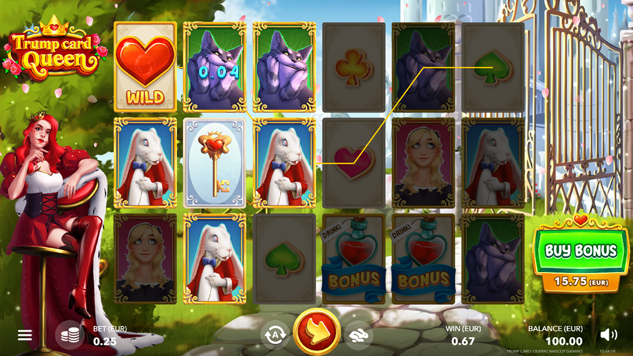 - Play Mode - Trump Card Queen is a 6x3 reel video slot game with 25 paylines, Wild Heart, Wild Heart Lock, and Drink Me Heart Bonus Symbols, Bonus Game, Super Bonus Game, Extra Bonus Game, Risk and Buy features.