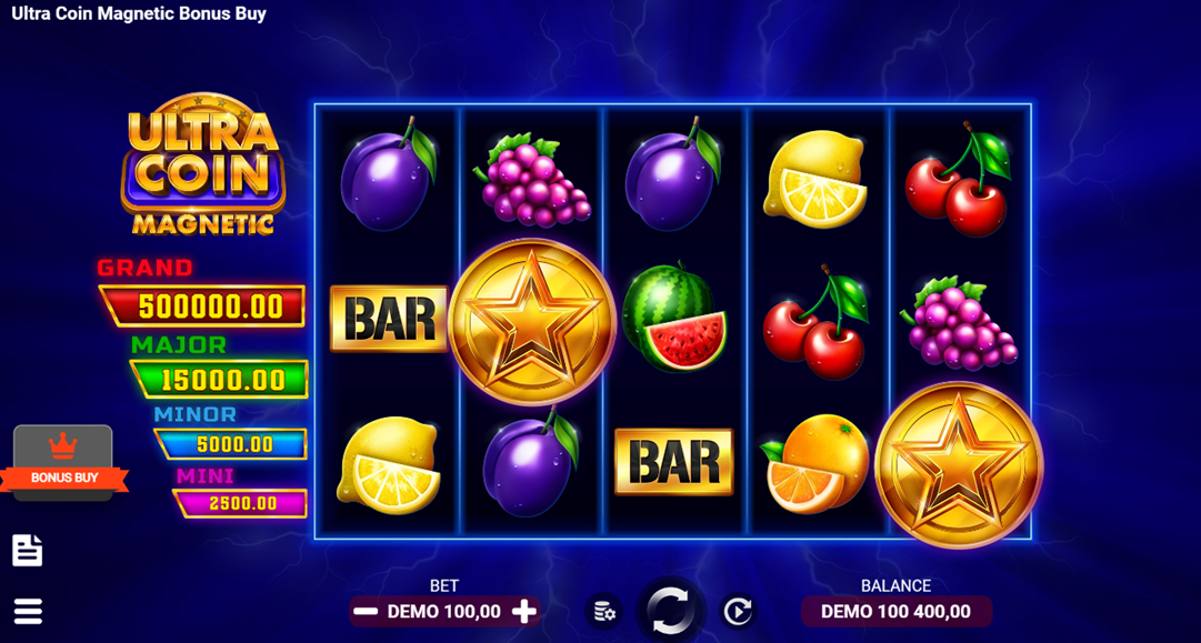 - Magnetic Coin graphics – Ultra Coin Magnetic: Bonus Buy has eye-popping shiny coin graphics and classic slot machine sound effects, with traditional fruit symbols, Wilds and Coins.