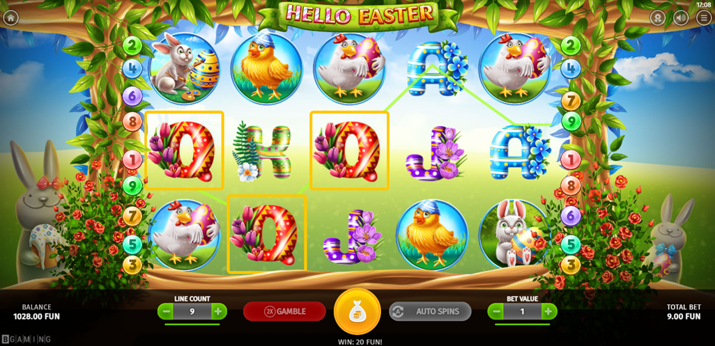 When you play Hello Easter by Bgaming, you will be spoiled with a happy, flowery backdrop where spectacular wins will mount up. You can use the “Gamble” feature to decide which came first, the chicken or the bunny. All in all, Hello Easter will make you revel in chasing after chicks for big wins. Gruff!