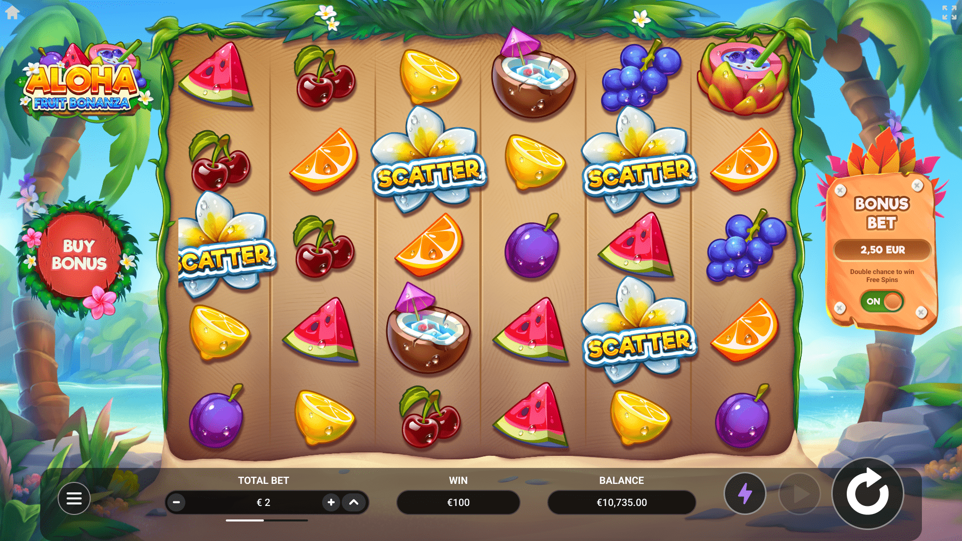- Play Mode - Aloha: Fruit Bonanza is a 6x5 reel video slot game with Scatter Pays, Juicy Spins, Cascades, and an RTP of 97% and a Maximum Multiplier of x7500.