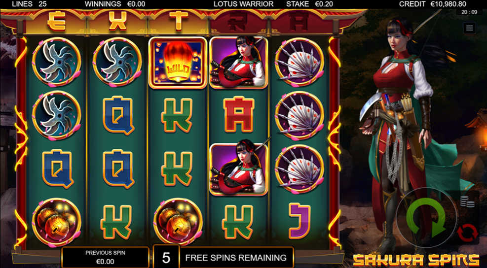 • Play Mode – Lotus Warrior is a 5x4 reel video slot game with Lantern Wild, Lotus Bonus, Expanding Wilds, Free Spins, Golden Bet and Gamble feature.