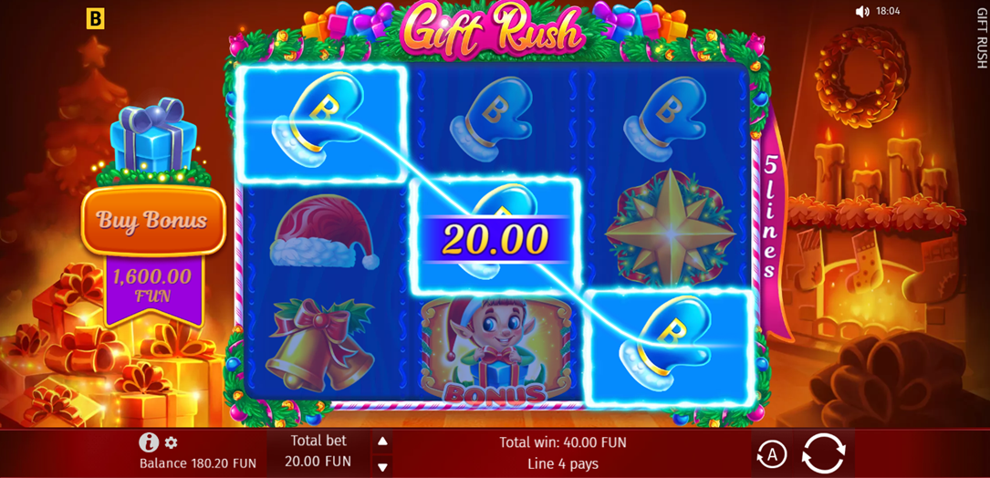 - Play Mode – Gift Rush is a 3x3 reel video slot game with 5 paylines and a Bonus symbol, Bonus Game and Buy Bonus.