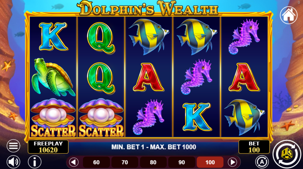 - Dolphin graphics – Swimming with the dolphins in Dolphin's Wealth with the dolphin graphics and classic casino sound effects, you will find yourself diving into the depths with seahorses, shells, fish, oysters, and Pearls.