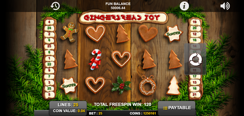 - Play Mode - Gingerbread Joy is a 5x3 reel video slot game with a Heart Wild, Gingerbread Man, Star Scatter Symbols, and Free Spins feature.