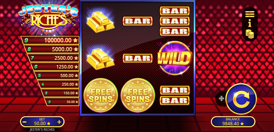 - Play Mode – Jester’s Riches is a 3x3 reel video slot game with 10 paylines, Wild and Scatter symbols, Jester Payouts, Unlimited Free Spins, and Gamble Round features.