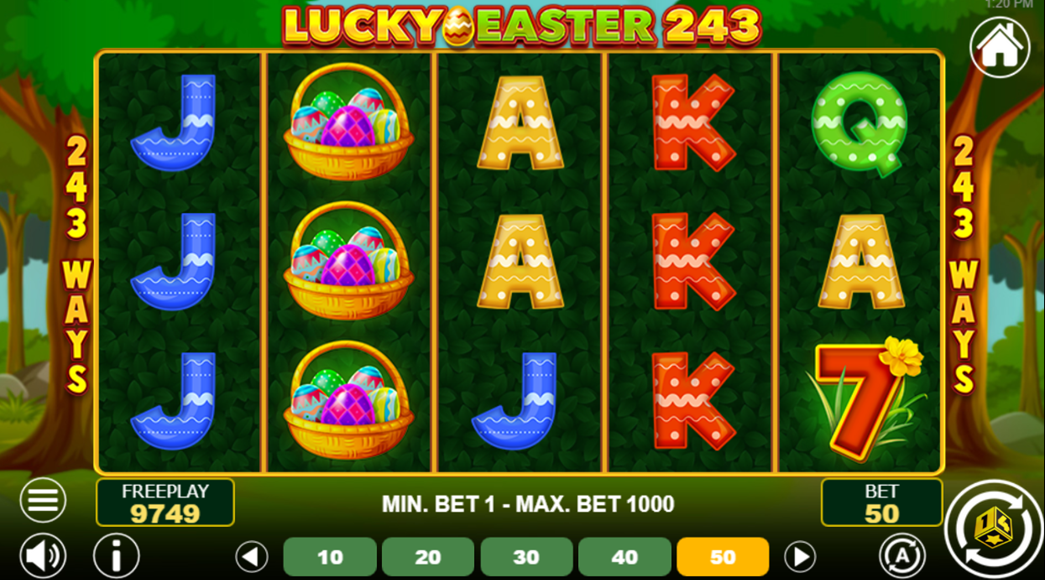 • Festive Graphics – Lucky Easter 243 has festive graphics and classic slot game sound effects laden with animated Easter Eggs, 7s, and Egg Baskets, sliding gracefully over the grid.