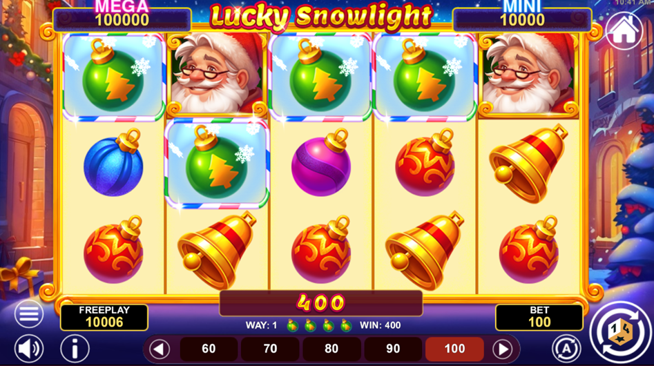 • Play Mode – Lucky Snowlight: Hold & Win is a 5x3 reel video slot game with 243 paylines, a Lollipop Bonus symbol, a Bonus Game with Hold & Win feature, and Mini and Mega Jackpots.