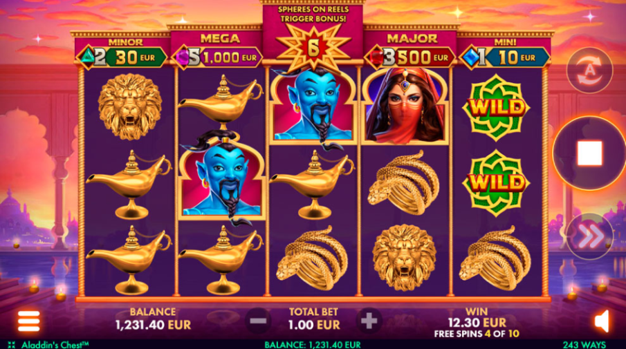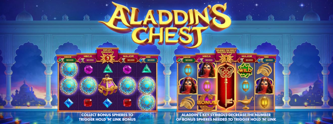 - Play Mode – Aladdin's Chest is a 5x3 reel video slot game with 243 paylines and has Bonus, Key +1 Spheres and Multiplier Symbols with Hold' n' Link and Jackpots