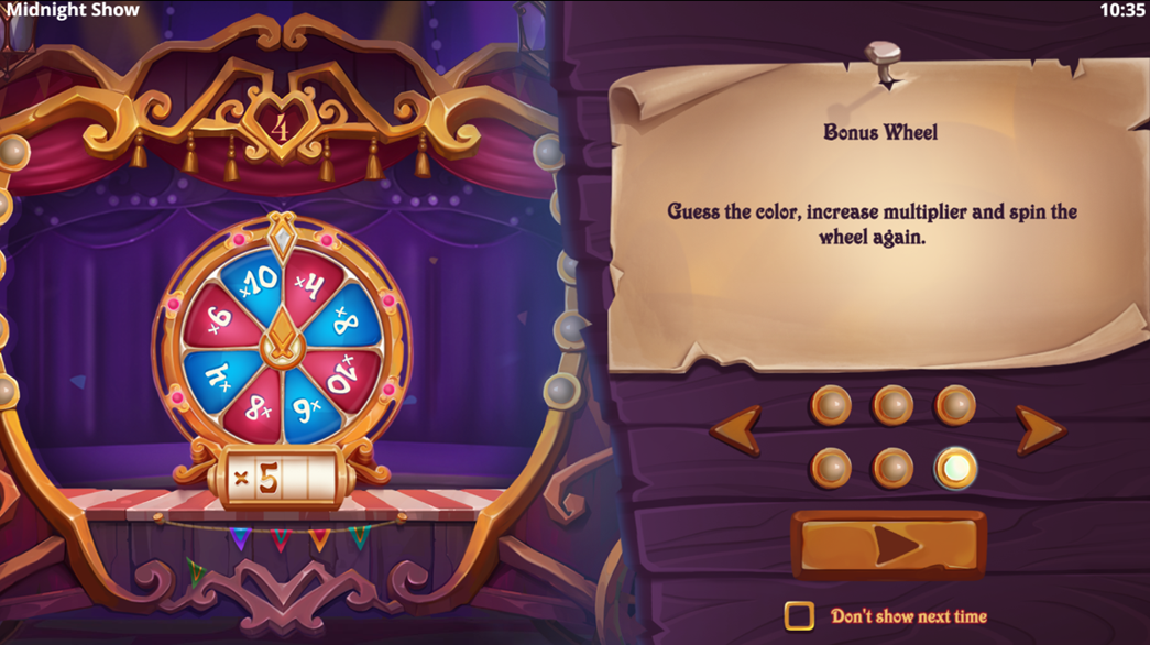 - Stage Show graphics - Midnight Show has lively stage show graphics along with haunting enchanting sound effects to offset by the curtains falling, the magical potions, and the lively animations of the Beauty Wild and the Showman Wild.