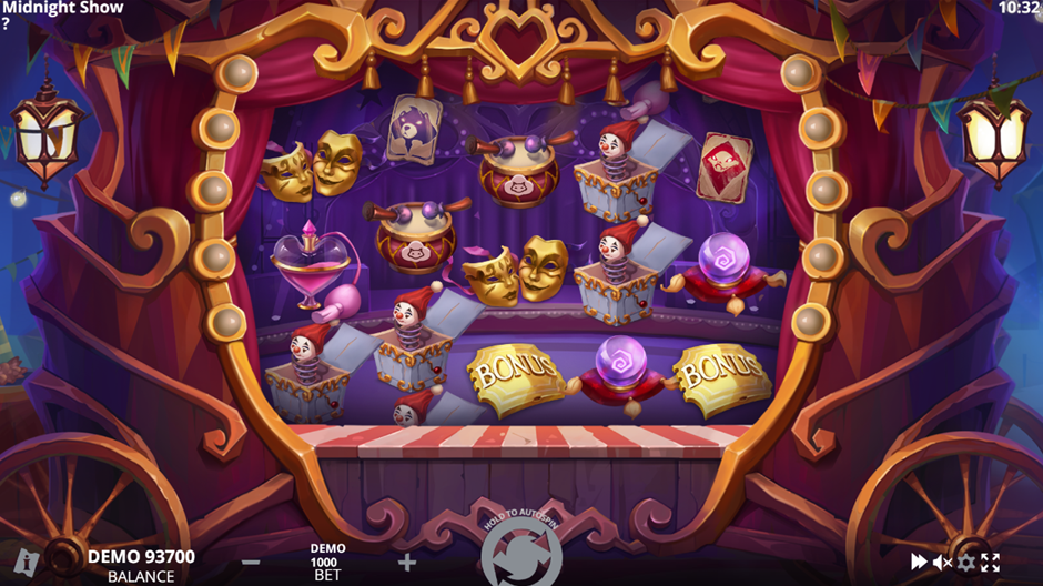 - Play Mode - Midnight Show is a 5x3 reel video slot game with 20 paylines, with Theatrical Mask Scatter symbol, Beauty Wild, Showman Wild, Hocus Pocus, Showman Walk, Beauty Walk, Bonus Wheel, and Midnight Show features.