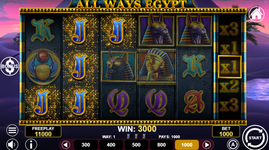 - Play Mode - All Ways Egypt is a 5x3 reel video slot game with 243 paylines and with an animated Golden Scarab Scatter, Reel Multiplier feature, and Bonus Spins.