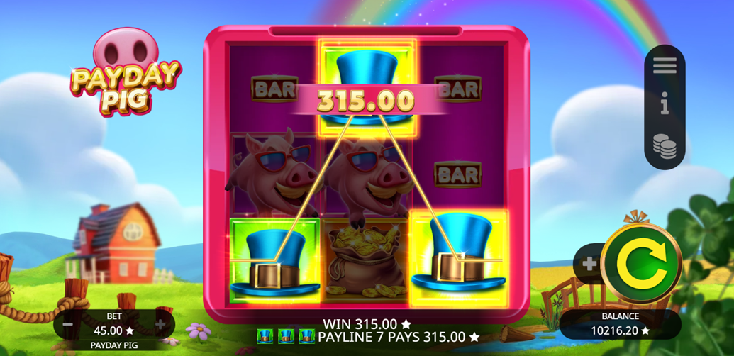 - Play Mode - Payday Pig is a 3x3 reel video slot game with 9 paylines, a Win Cap of x1 500 of the base bet, Wild and Piggy Factor symbols, Piggy Factor Re-spins, and Piggy Factor Free Spins.