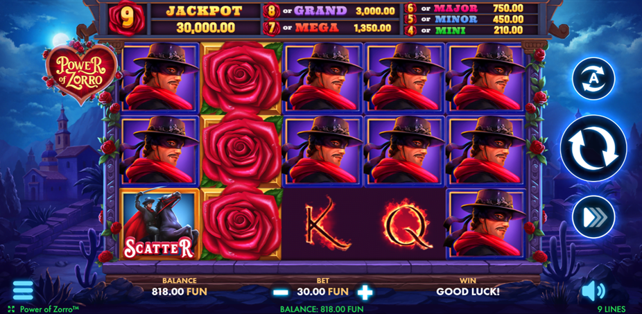 • Play Mode - Power of Zorro is a 5x3 reel video slot game with 9 paylines, Wild Multiplier, Jackpot Wild, Scatter, Jackpot Trigger, Free Spins, and Jackpot features.