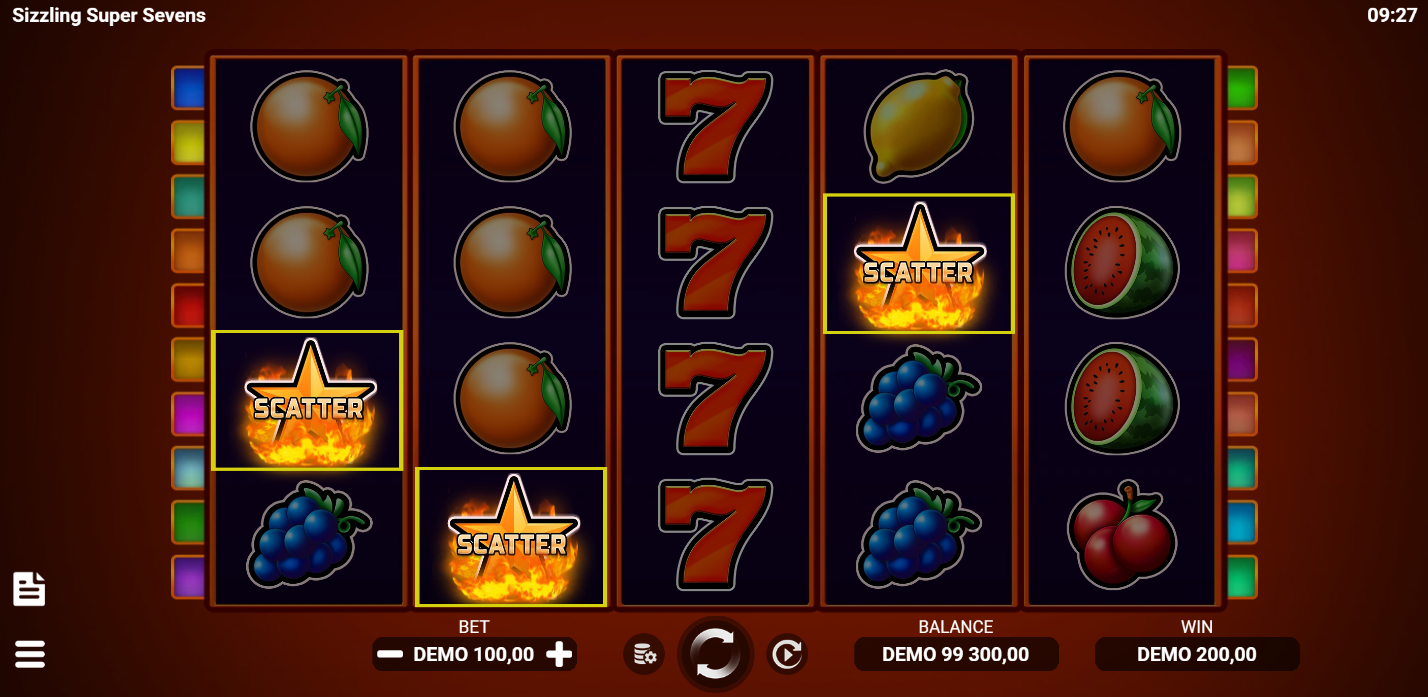 - Super Seven Graphics – The traditional casino sound effects and super seven graphics in Sizzling Super Sevens will get you prepared for the fiery fruity wins, with cherries, watermelons, oranges, lemons, plums, grapes, Stars, and sizzling 7s adorning the grid.