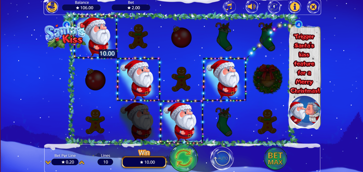 If you love Christmas decorations and gingerbread men, Santa’s Kiss Santa’s Kisszz will set the tone for the Christmas Season. This Christmas-themed slot game from Booming Games has some cute Santa graphics, and getting a kiss from Santa in Santa’s Kiss with the Wild Christmas Tree, mistletoe, and holly, you will get directly into a jolly mood to play Santa’s Kiss.