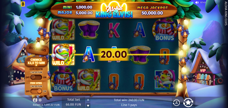 - Play Mode – Aloha King Elvis Xmas Edition is a 5x3 reel video slot game with 25 Win lines and features, which include Respins, Buy Bonus, Buy Chance, an In-game Jackpot, and Bonus Game.