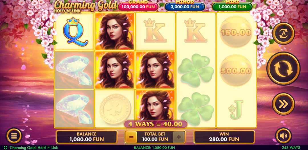• Minimum and maximum bet - Charming Gold: Hold 'n' Link has a 0.20 minimum bet and a maximum bet of 100.00.