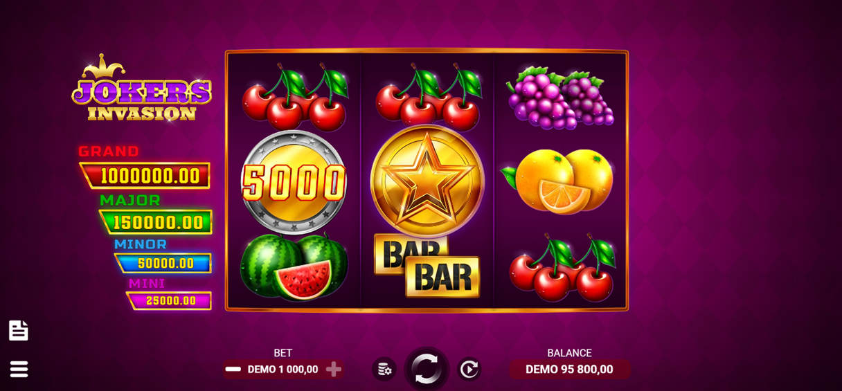 - Play Mode – Jokers Invasion is a 3x3 reel video slot game with a Maximum Multiplier up to x1000, a Joker, Bonus and Star Bonus symbols, a Joker Bonus Game, Coin Rush, and Jackpot features.