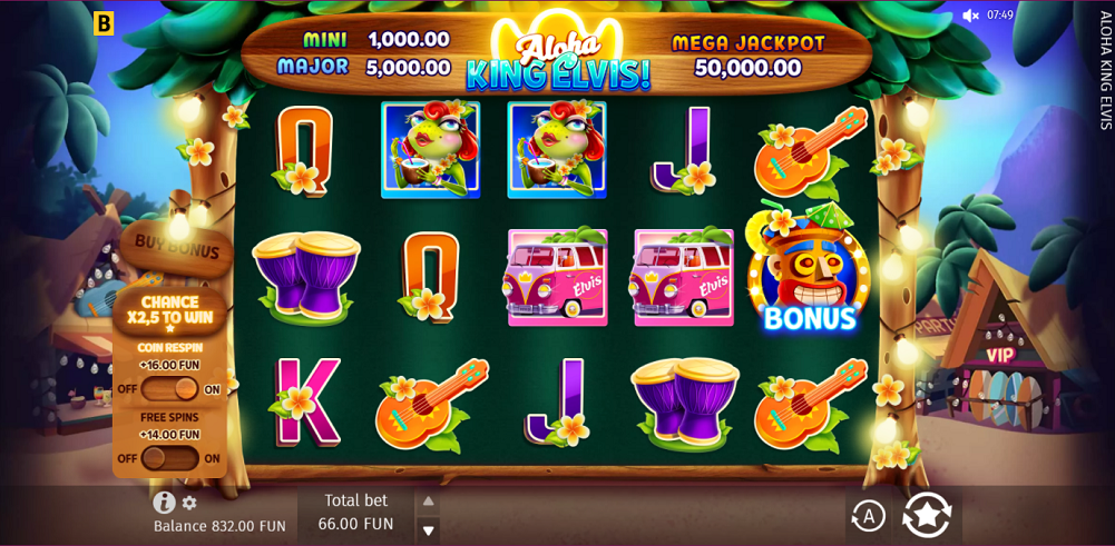 - Play Mode - Aloha King Elvis is a 5x3 reel video slot game with 25 Win lines, and features which include Respins, Buy Bonus, Buy Chance, an In-game Jackpot, and Bonus Game.
