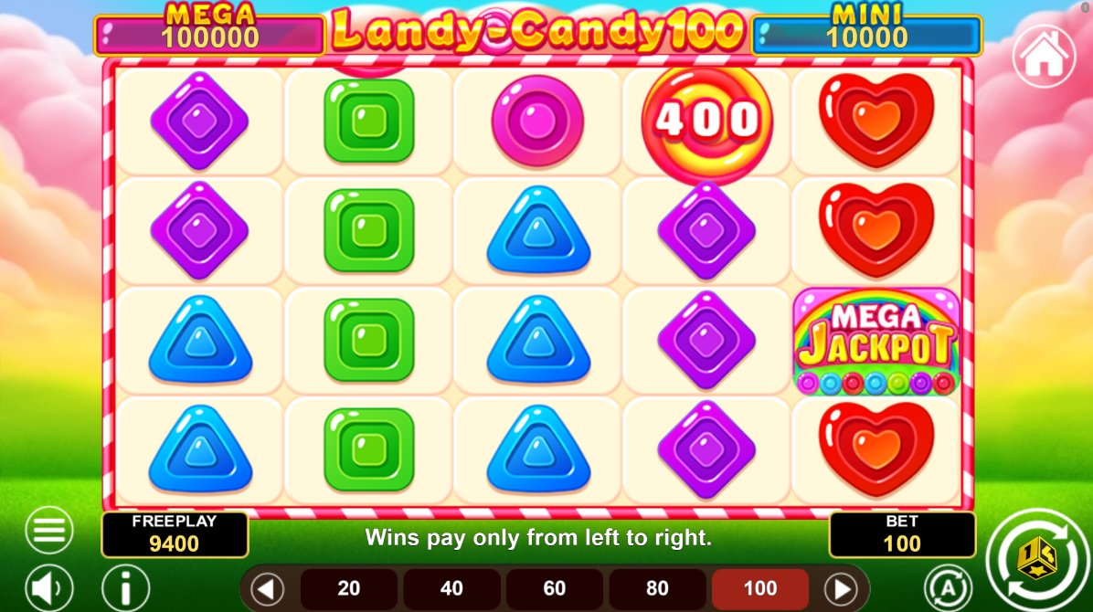 • Play Mode - Landy Candy 100 is a 5x4 reel video slot game with a total of 100 paylines and has a Wild and Coin Symbol, with Mega and Mini Jackpot features.