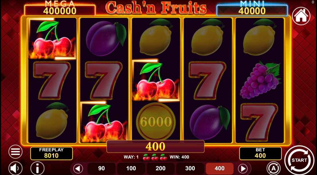 - Play Mode - Cash ‘n Fruits 100: Hold ‘n’ Win is a 5x4 reel video slot game with 100 paylines, a 7 Wild symbol, a Coin symbol with Multipliers, and a Chance + feature.