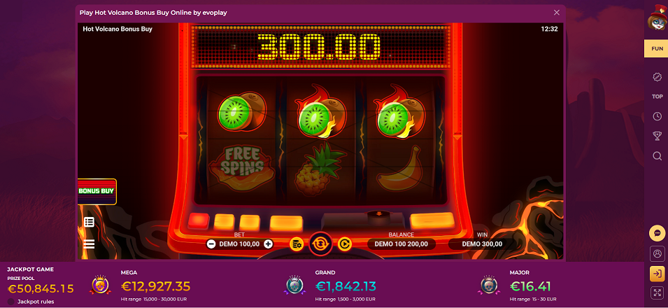 - Fruits on Fire - When the Fruits on Fire symbol pops up it will substitute the regular fruit symbol and give more winnings. Look at the pay table in the info section of Hot Volcano Bonus Buy to see the range of hot payouts.