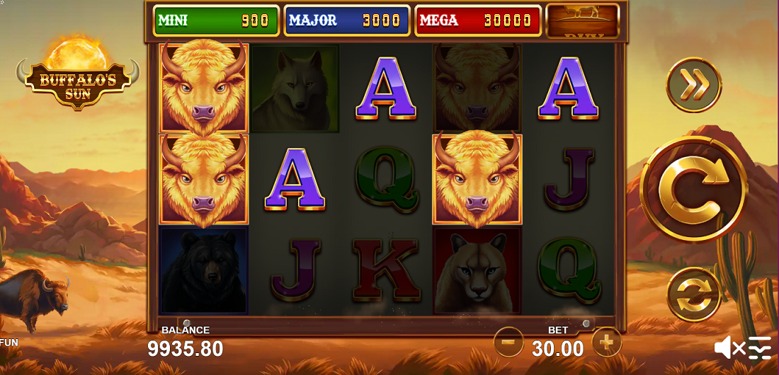 - Play Mode – Buffalo’s Sun Hold ‘n’ Ring is a 5x3 reel video slot game with 25-win lines, Scatter Symbols, a Bonus Sun and a Mega Jackpot feature.